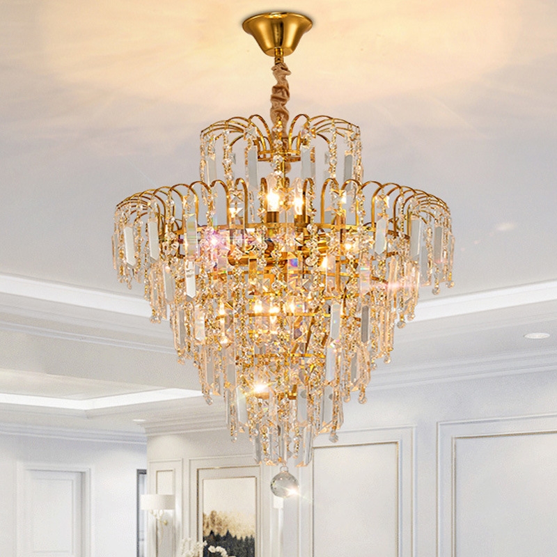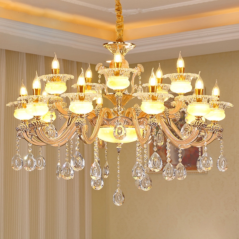 Chất liệu của đèn: Thường sử dụng chất liệu cao cấp, độ bền cao như các hạt pha lê lấp lánh tạo ra sự hoành tráng và bề thế, quý phái, khung được làm bằng hợp kim chắc chắn, mạ màu vàng hoặc màu đồng nổi bật, cổ kính.